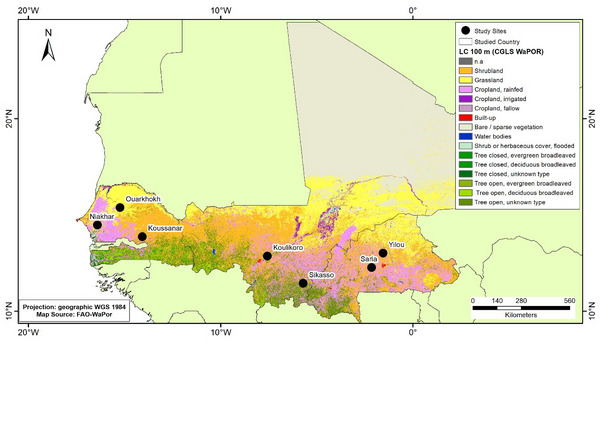Les caractéristiques climatiques (précipitations), biophysiques (altitude, groupes de sols, carbone organique du sol) et la végétation (couverture du sol - couverture arborée/arbustive) ont été cartographiées à l'échelle régionale(Sénégal,Mali,Burkina Faso) (Fig. 2) et à l'échelle du site en utilisant les bases de données existantes, par exemple WaPOR, ISRIC, TAMSAT.