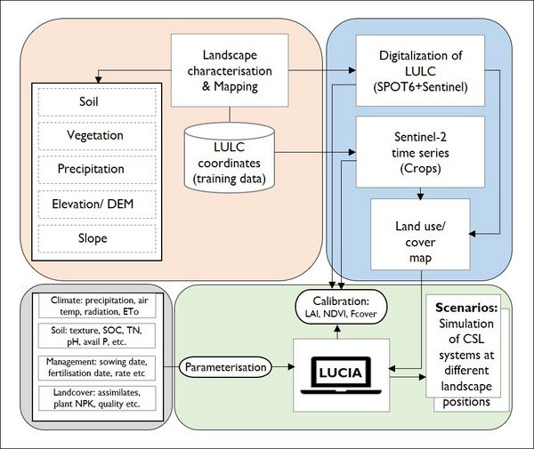 La modélisation au niveau du paysage implique de regarder au-delà des limites du champ où les pratiques et les activités de gestion liées aux systèmes de culture, d'arbustes et d'élevage (CSL) sont généralement mises en œuvre dans les exploitations individuelles pour atteindre les objectifs de production. À l'échelle du paysage, les différentes utilisations des terres sont interconnectées, ce qui rend les choses complexes. À cette échelle plus large, une perspective foncière plus complète fournit une optique dominante à travers laquelle les interventions peuvent être fournies. Dans le même temps, la compréhension du fonctionnement des champs individuels dans un paysage plus vaste peut aider à identifier où et comment concevoir les systèmes ASC pour qu'ils soient plus productifs. Plusieurs travaux de recherche ont évalué l'adéquation des systèmes agroforestiers (AF) à cette échelle. La plupart de ces approches manquaient de mécanismes de rétroaction entre les cultures, les arbres/arbustes et les composants du bétail pour faciliter la réflexion sur les systèmes. De plus, l'identification de la pertinence des options ASC implique l'évaluation de leurs impacts à long terme sur l'économie agricole et les fonctions de l'écosystème. Nous présentons donc une approche de modélisation au niveau du paysage (Fig. 1) qui intègre la télédétection, les SIG et les fonctionnalités d'apprentissage automatique pour mieux comprendre les réponses du système aux gradients climatiques et biophysiques afin d'identifier l'adéquation des systèmes ASC à différents endroits du paysage dans les zones semi-arides.