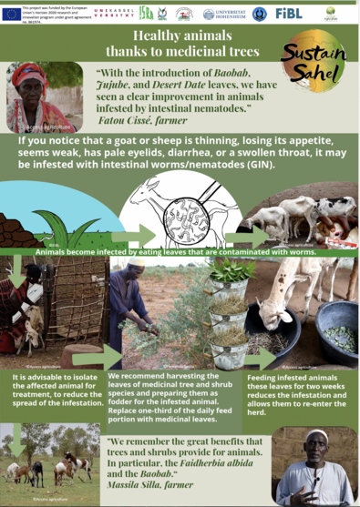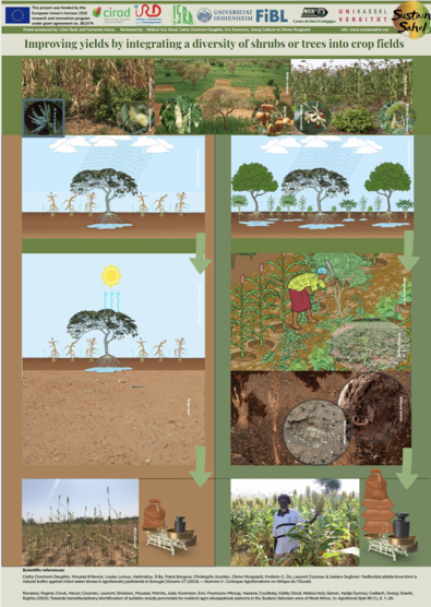 Le poster, disponible en anglais et en français, présente le projet SustainSahel. Le projet combine les sciences naturelles et sociales avec une approche transdisciplinaire qui réunit chercheurs et agriculteurs pour mettre en œuvre des systèmes alimentaires durables. L'intégration systématique des cultures, des arbustes, du bétail et des personnes, ainsi que les pratiques de l'agriculture biologique et de conservation, sont les typologies de reconception et les interventions les plus prometteuses pour une intensification durable.