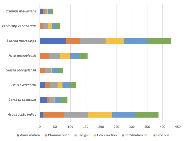These woody plants, which are the most popular with sheep, are also used for other purposes by the population (see Figure 2). Thus, there is a strong anthropic pressure on these woody species which could negatively impact the survival of these species as highlighted by Dossou et al. (2012) and Ouattara et al. (2021).