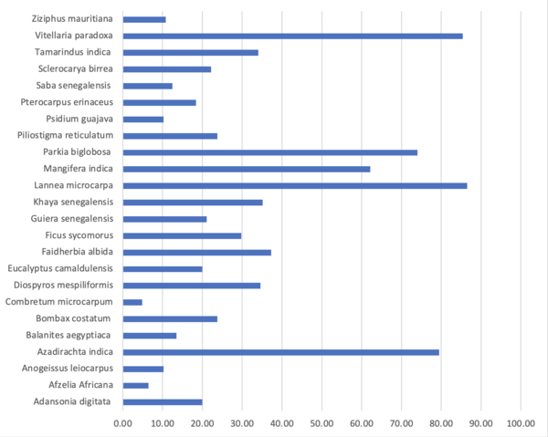 From this study, 47 woody plants were identified among the population, of which 23 were cited by more than 5% of the respondents (see Figure 1). The respondents recognise the use of woody plants in several use categories, including: food, pharmacopoeia (human and animal), soil fertilisation, firewood and construction wood. The sale of wood and non-wood forest products is also a significant source of income for the surveyed populations.