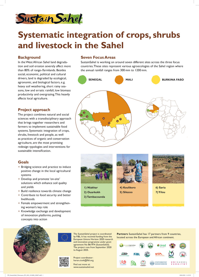 The poster, available in English and French, introduces the SustainSahel project. The project combines natural and social sciences with a transdisciplinary approach that brings together researchers and farmers to implement sustainable food systems. Systematic integration of crops, shrubs, livestock and people, as well as practices of organic and conservation agriculture, are the most promising redesign typologies and interventions for sustainable intensification.