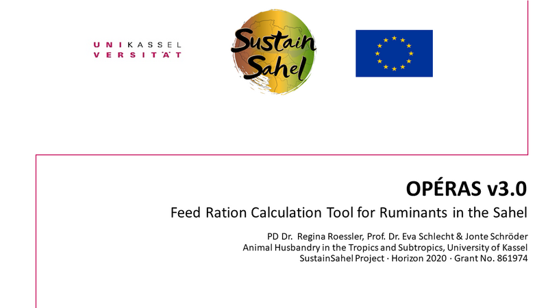 OPERAS has been developed by Mr. Schröder and Dr. Regina Roessler within Work Package 6 of SustainSahel. It is an Excel‑based tool designed to support optimized ration formulation for small and large ruminants, making the best use of feed resources that are available locally across the Sudano‑Sahelian zones of West Africa, with their nutritional characteristics fully integrated. While not intended for direct use by farmers, it serves as a practical decision‑support and advisory tool for extension agents working in governmental and non‑governmental organizations—putting locally available feeds at the heart of sustainable livestock nutrition. The training familiarized participants with the tool's structure and application, while also providing valuable feedback to the developers by highlighting opportunities for further refinement to better reflect field realities. OPERAS is available in English and French, along with user handbooks in both languages. Access the tool via the link below.